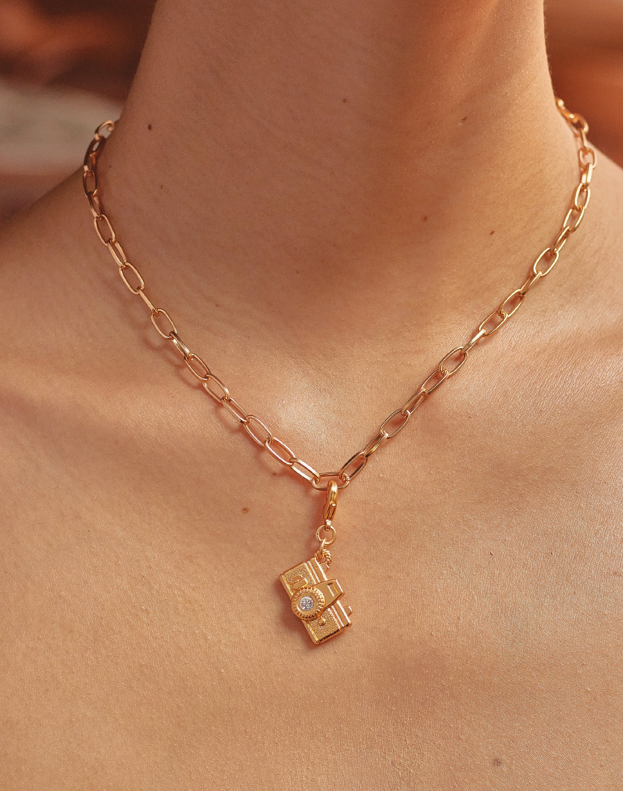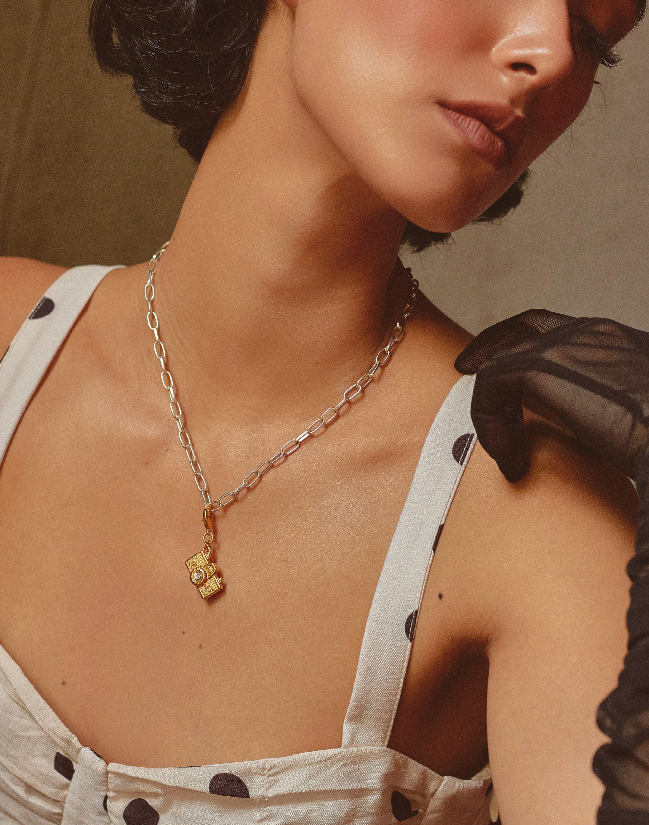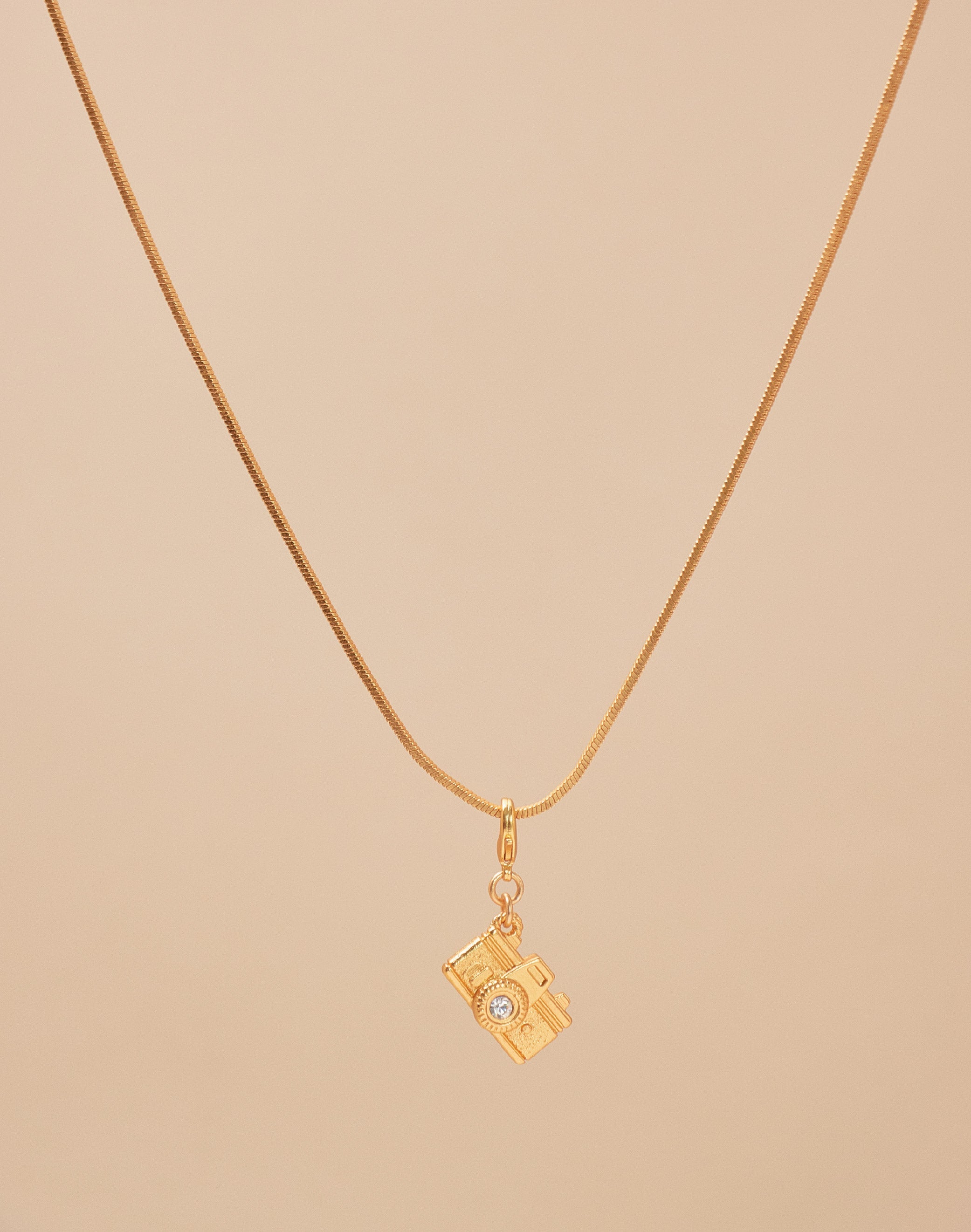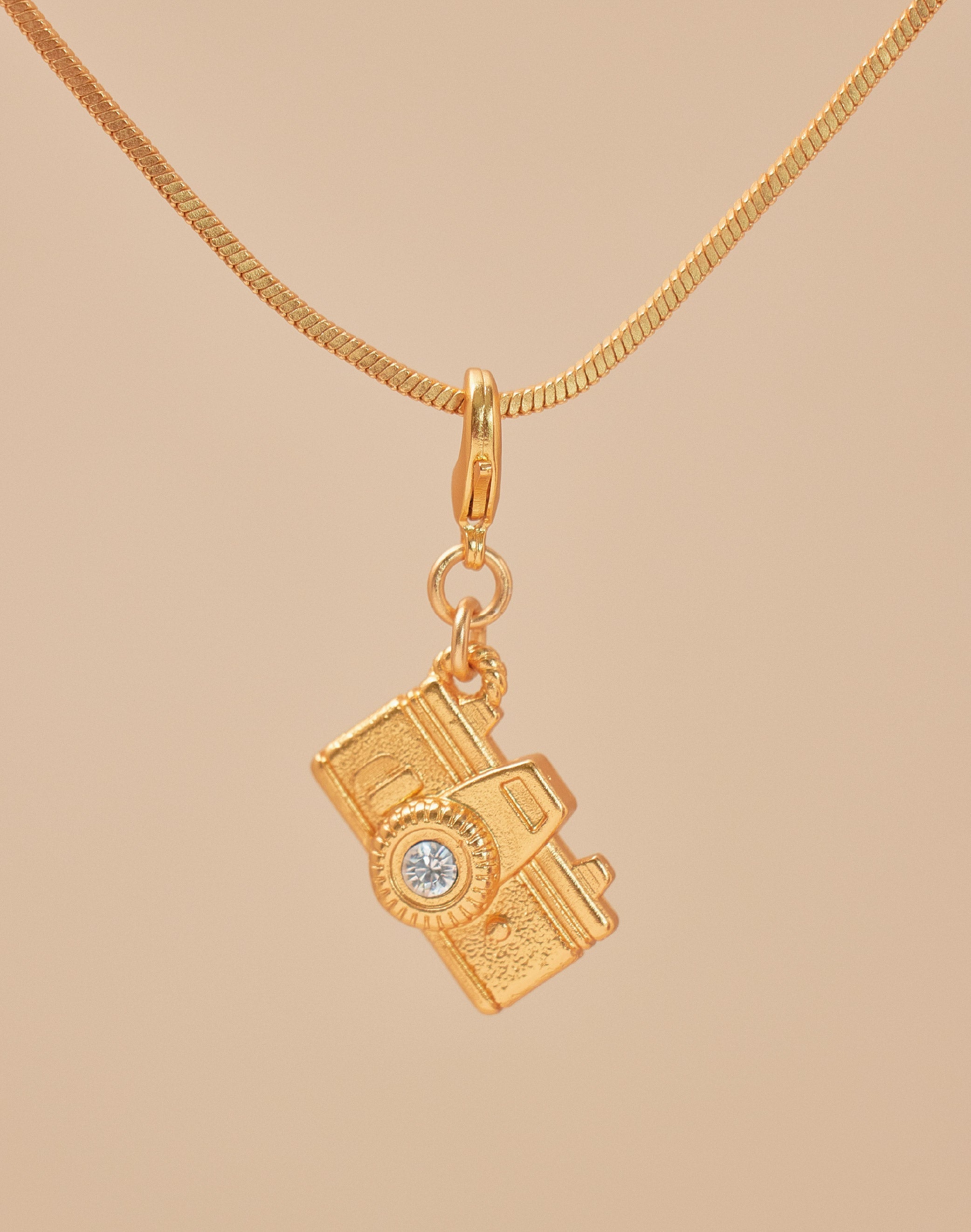 Este charm cámara simboliza los recuerdos que se guardan en imágenes y en la memoria, esos que cuentan historias sin palabras.