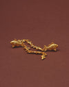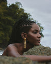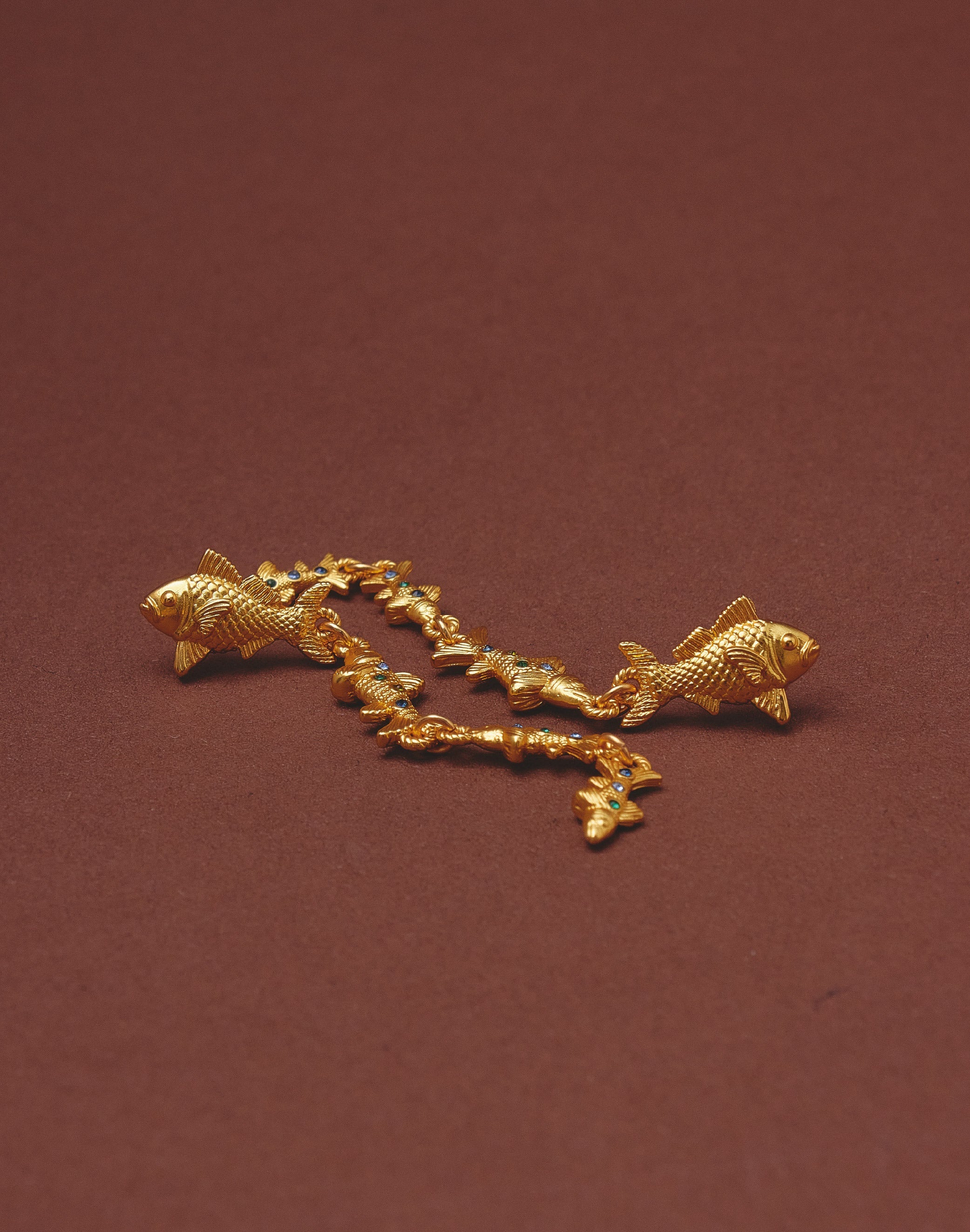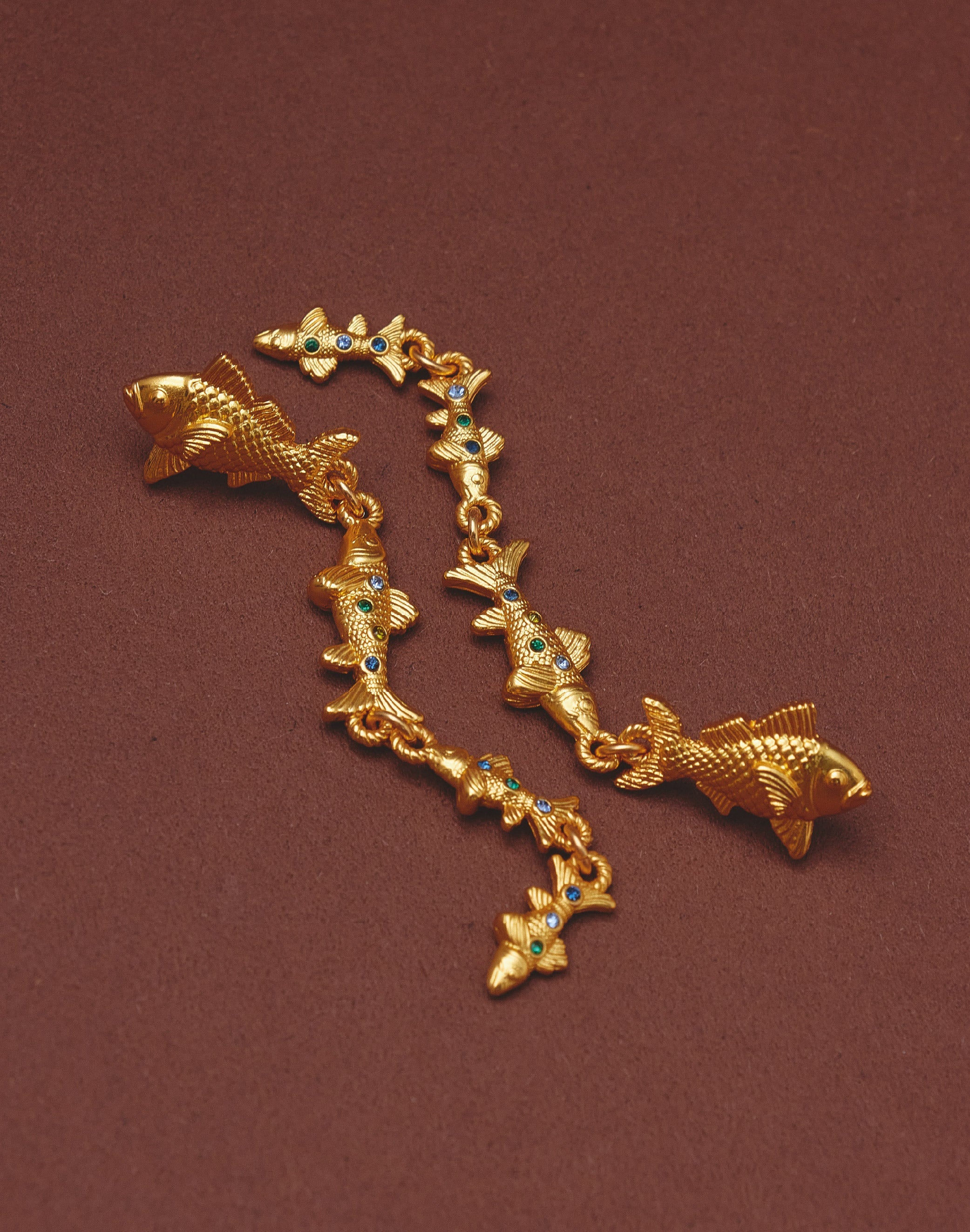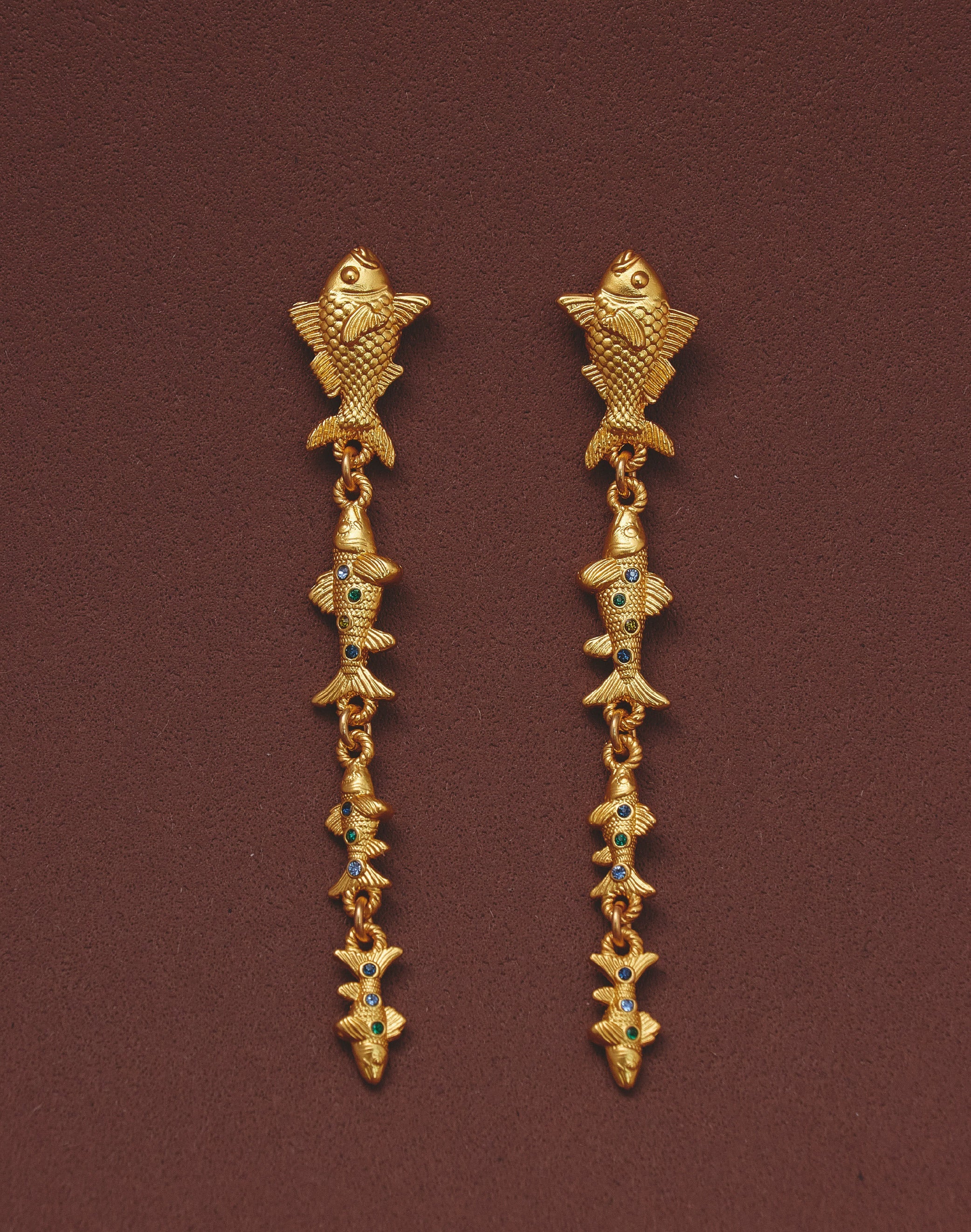 Pendientes largos inspirados en el movimiento de los cardúmenes del Pacífico colombiano. Su diseño en cascada presenta un pez principal de mayor tamaño seguido por peces que disminuyen progresivamente, creando fluidez y dinamismo. Los cristales en tonos dorado, verde y azules evocan los reflejos del mar en constante movimiento.
