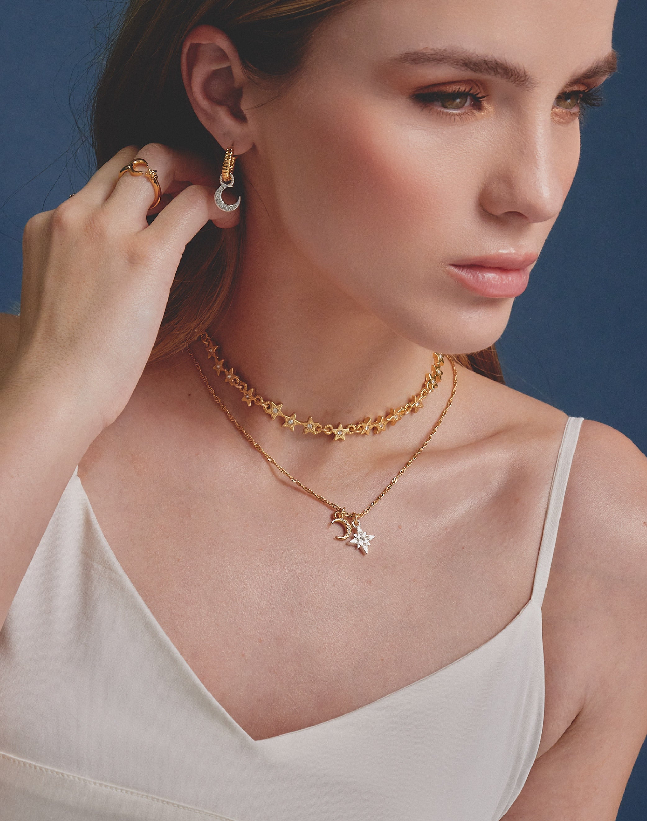 Estas candongas combinan el brillo del oro y la plata para un look único. Cada una lleva un dije removible: una estrella y una luna. Cambia los dijes cuando quieras...