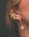 Candongas en oro que capturan la esencia del lujo, complementadas con un dije de estrella en plata que añade un toque especial. La armonía entre estos dos baños crea un efecto único que funciona para cualquier momento.