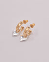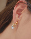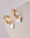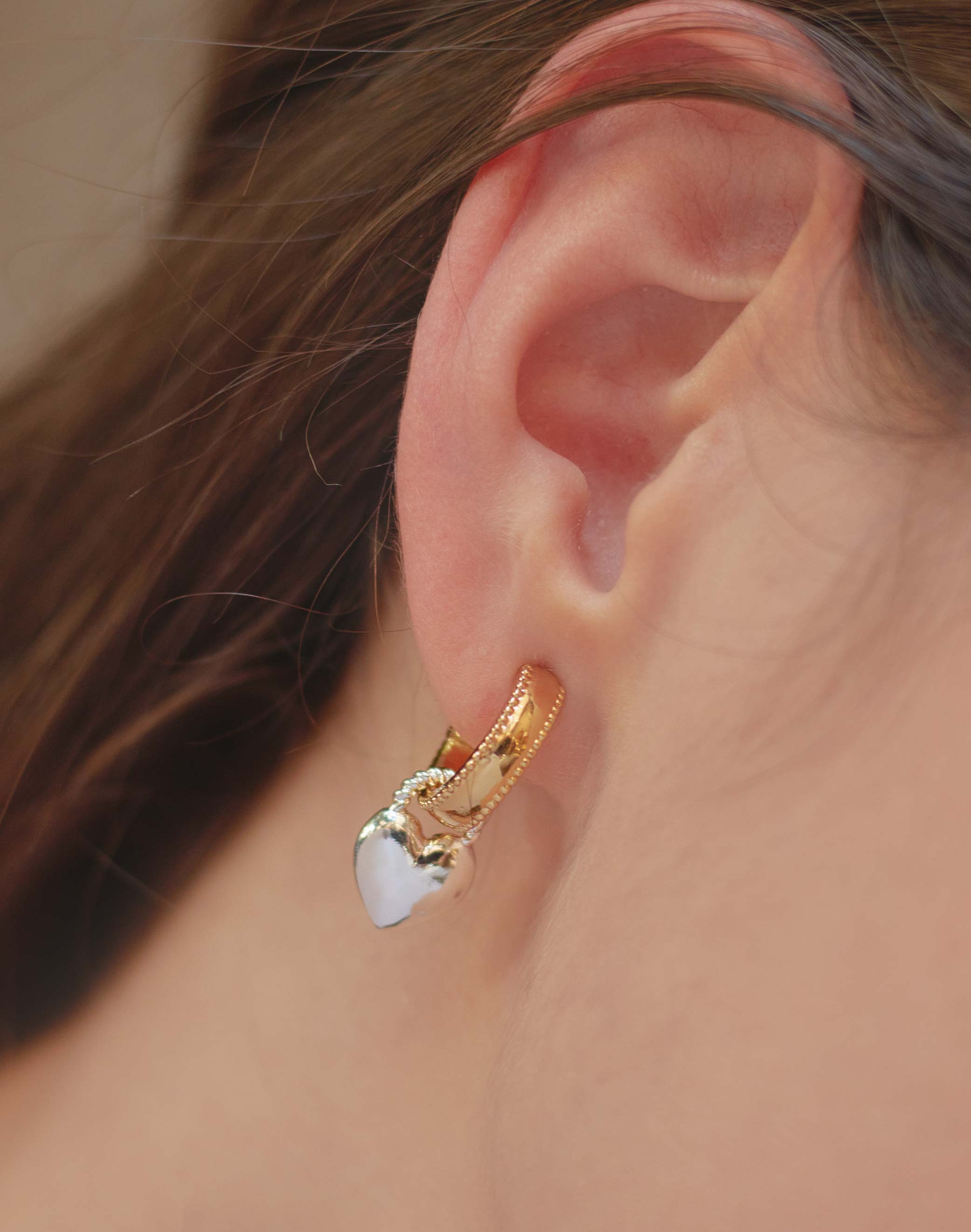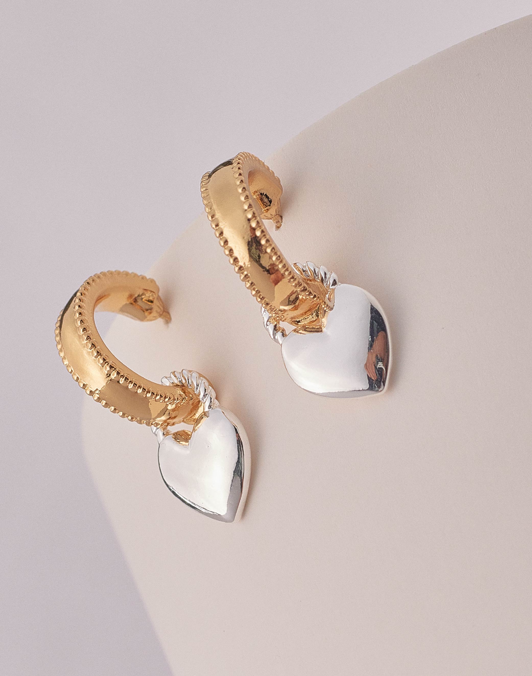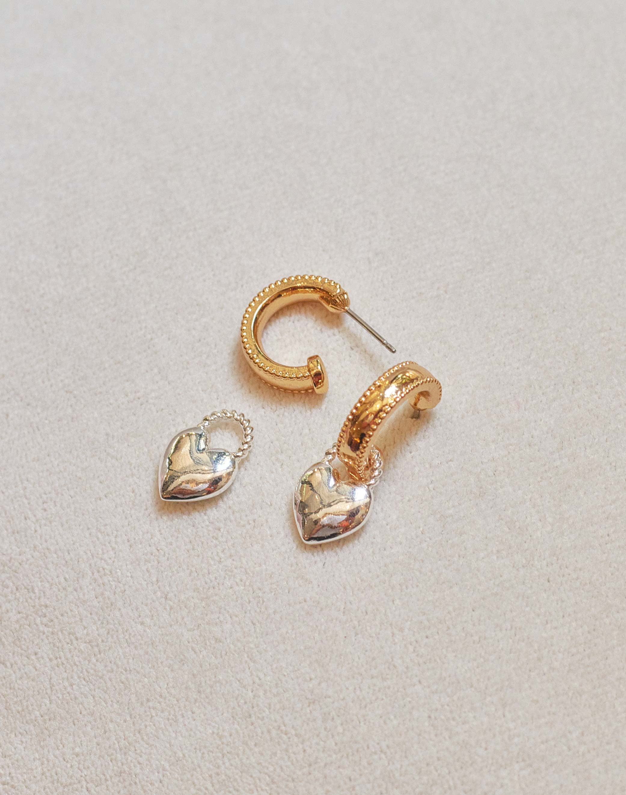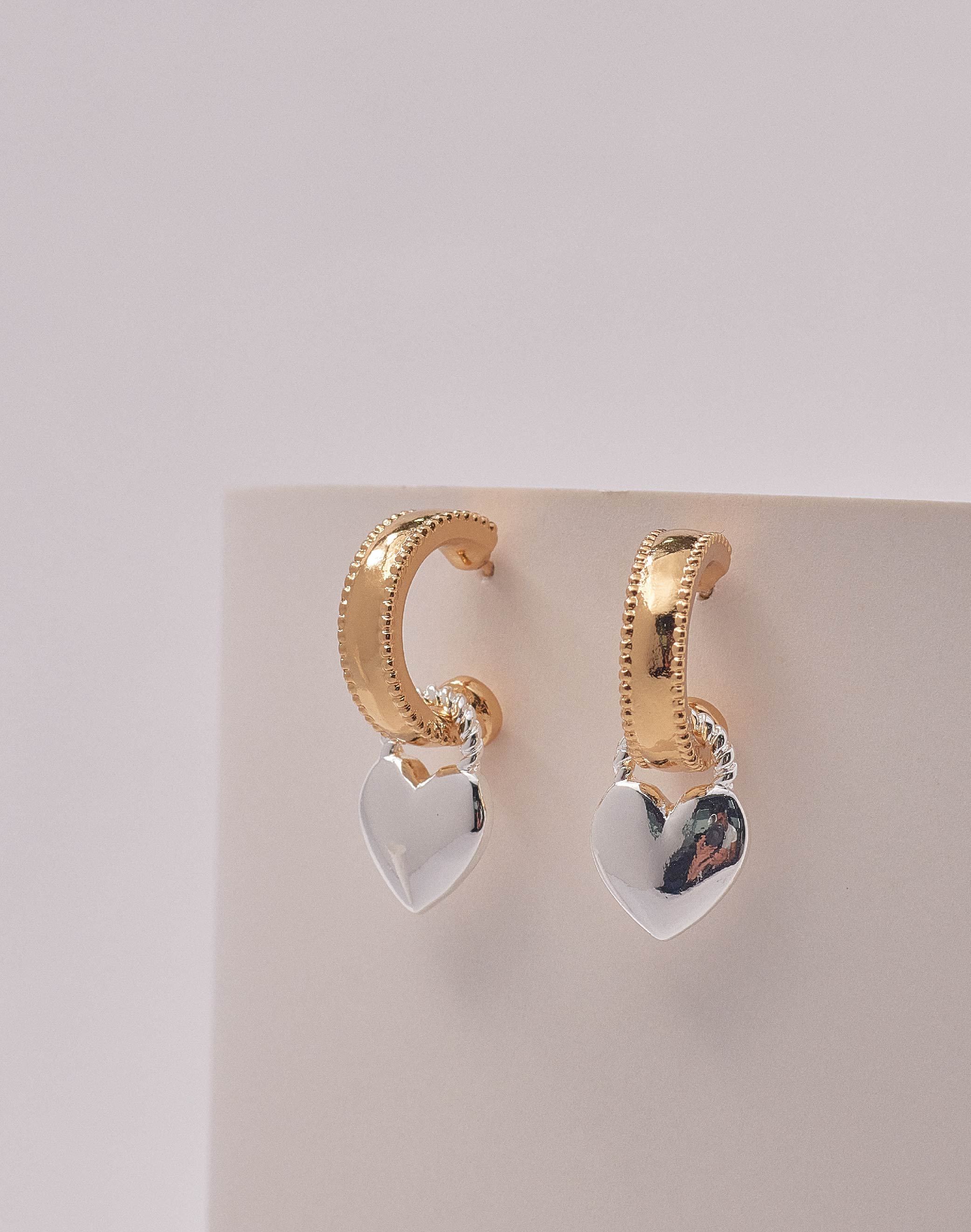 Mini candongas doradas con charm de corazón bold en plateado. Un esencial que necesitas para estar trendy con el mix and match y que puedes usar según el mood del día, pues los dijes son removibles.