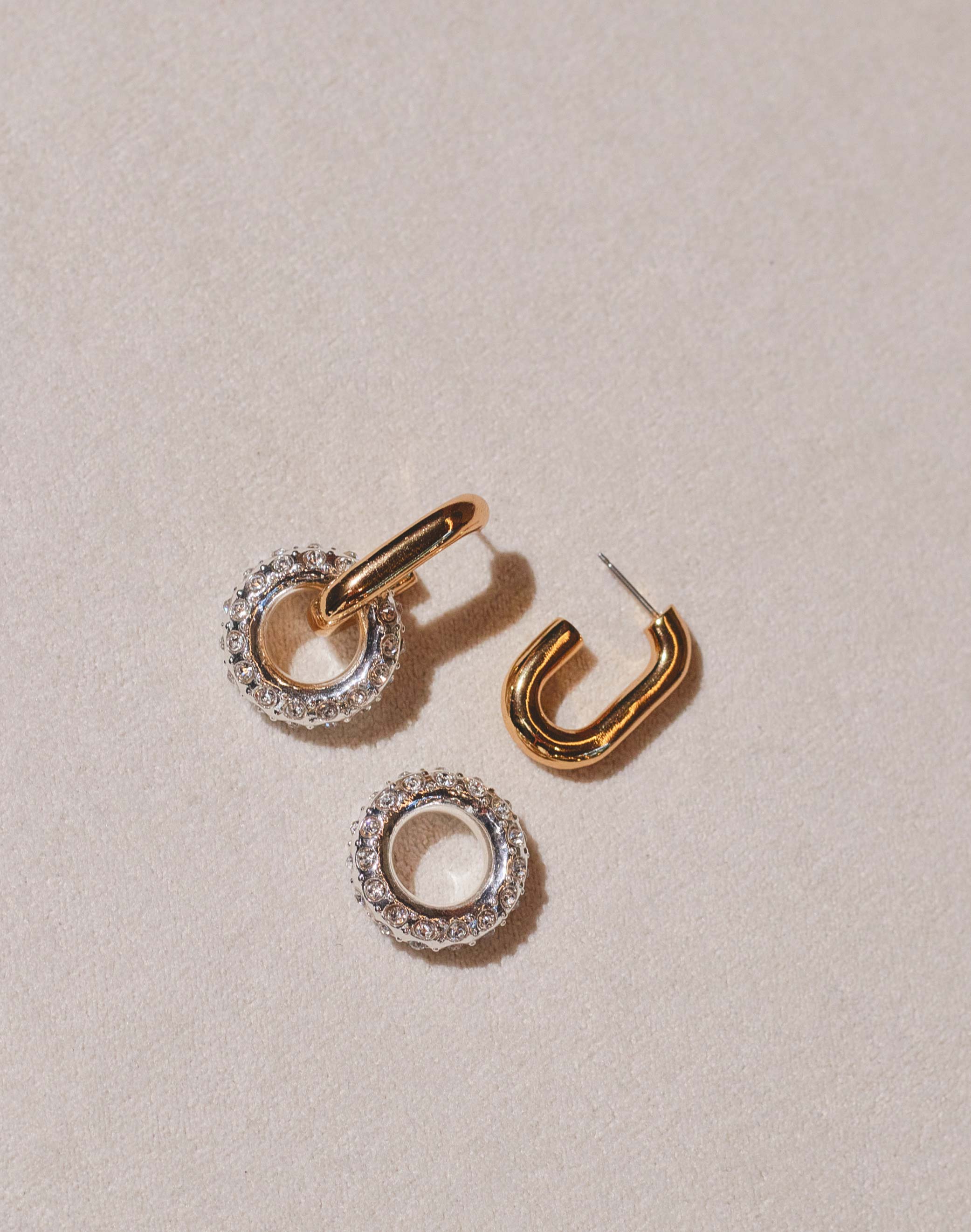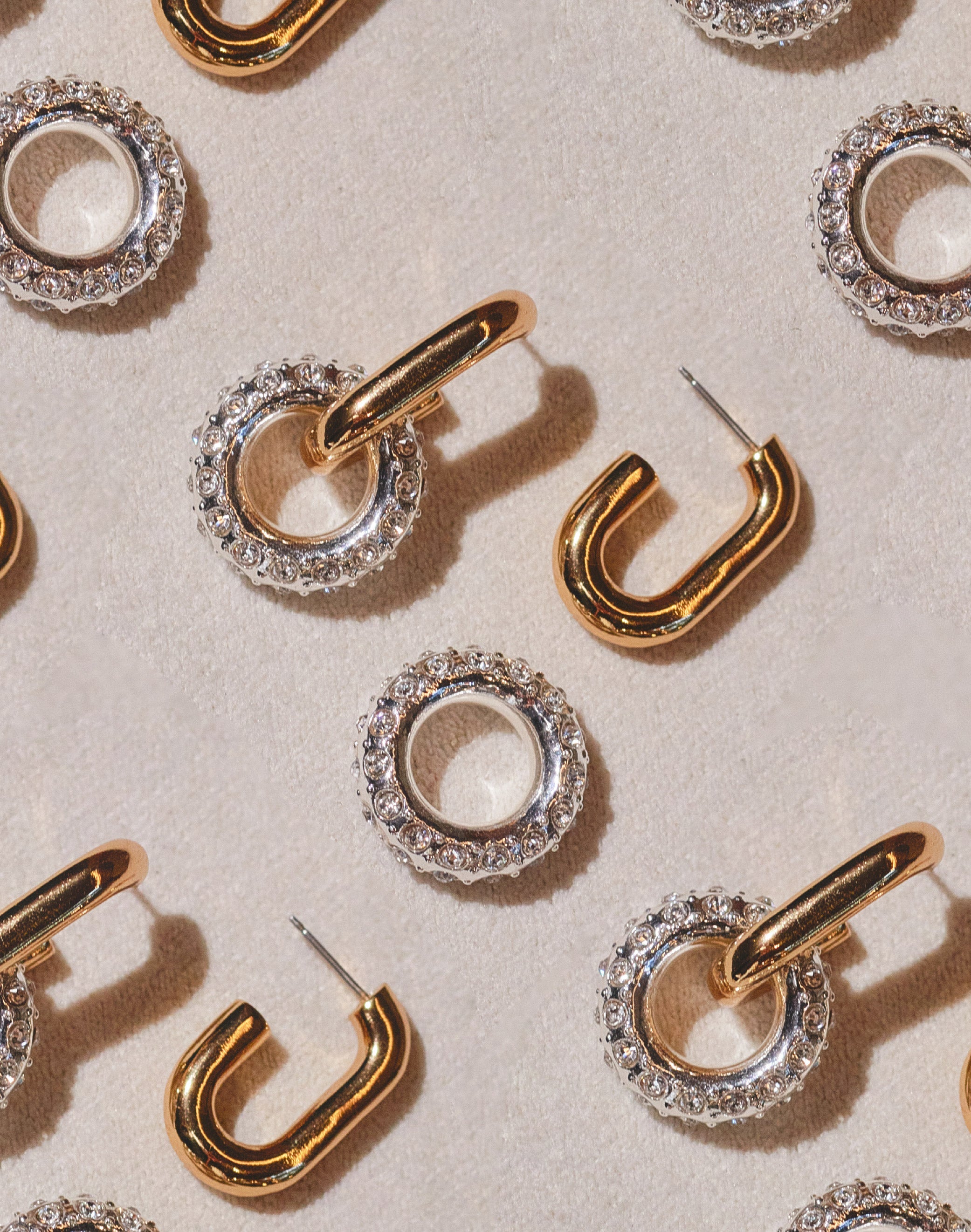 Unas candongas con dije removible, ideales para quienes saben que demasiado brillo, nunca es suficiente. Úsalas con el aro plateado destellante, como statement piece y retíralo de la candonga cuando prefieras un look más cómodo y clásico.