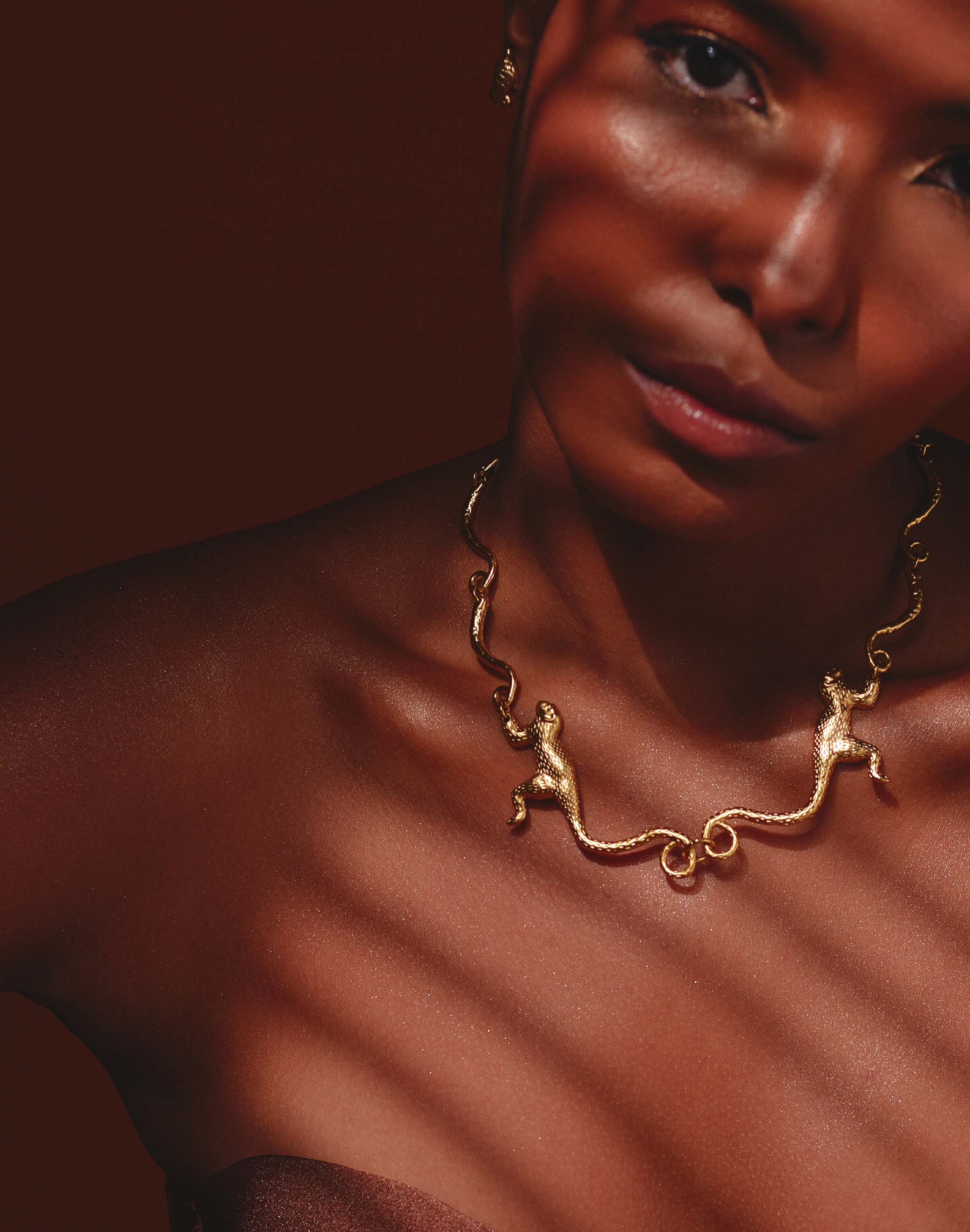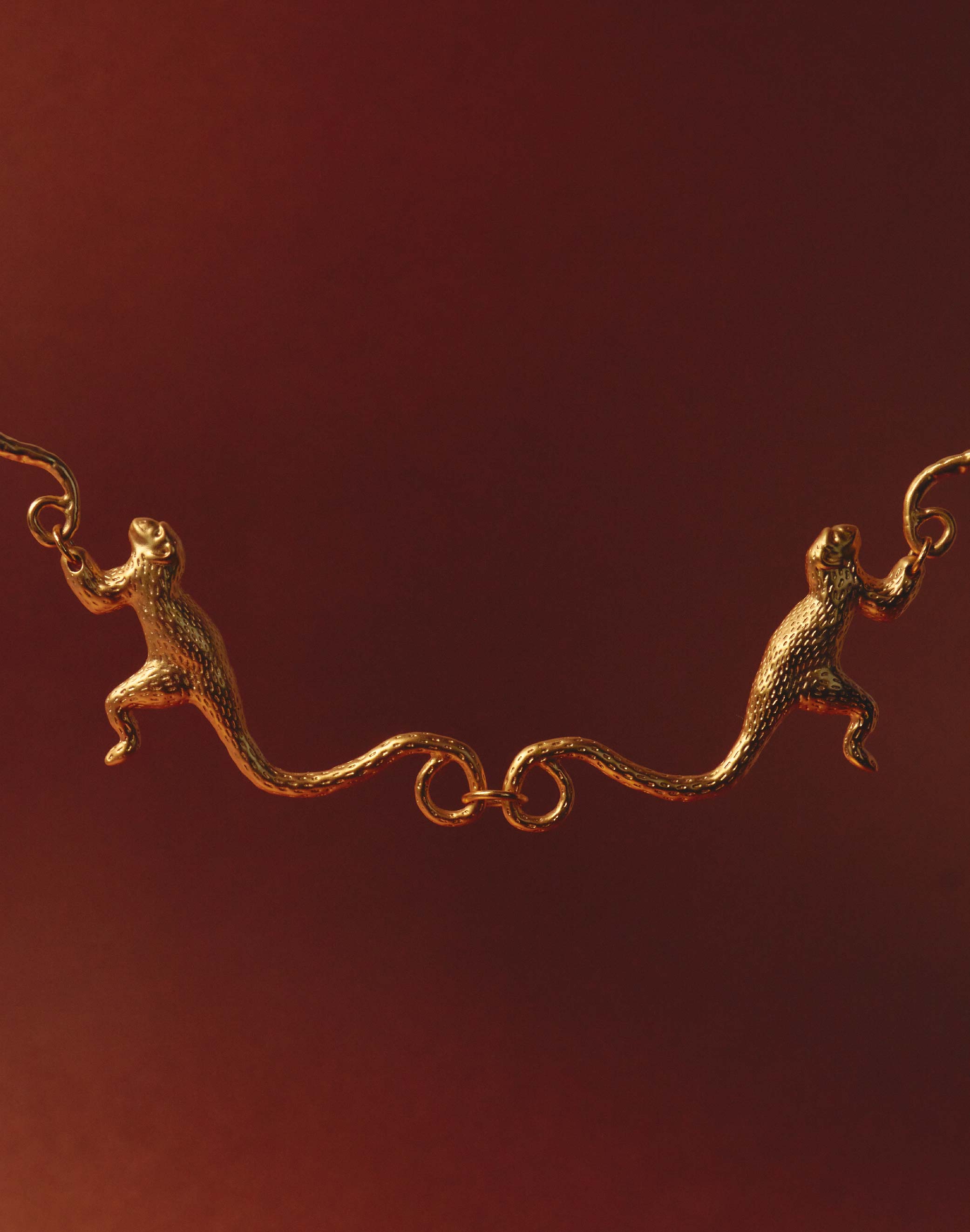 Nuestro Collar con dos Monos Tití unidos por la cola cuelgan para darle un toque divertido y único a tu estilo. ¡Ideal para los amantes de la naturaleza y la originalidad!