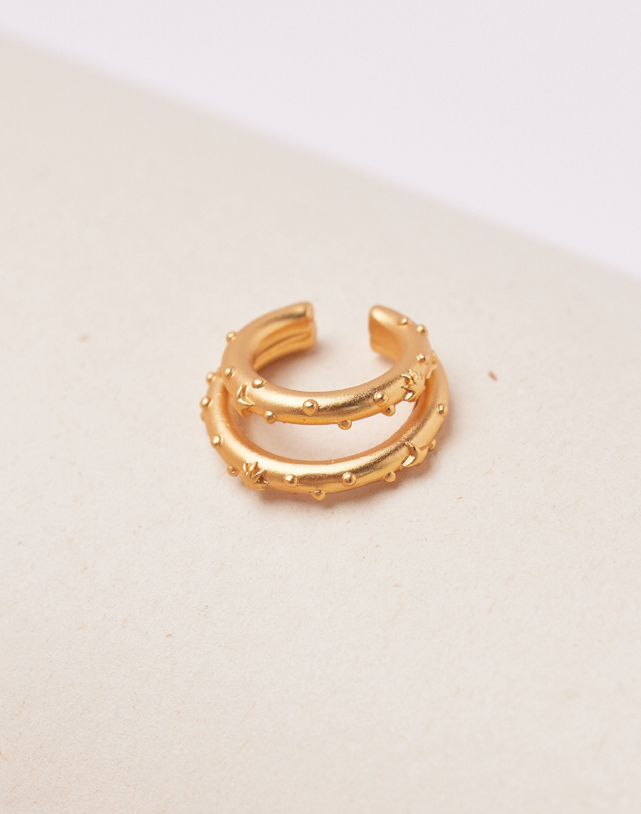 La versatilidad de este set es todo lo que el verano necesita. Ideal para lograr tres looks diferentes o crear un layering lleno de magia, combina aretes y earcuff con cristales de vidrio y un baño de oro semibrillante.