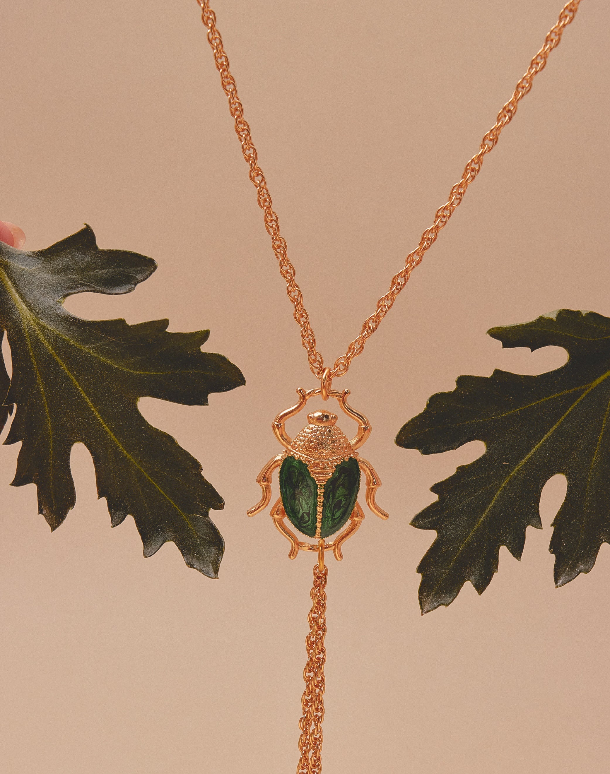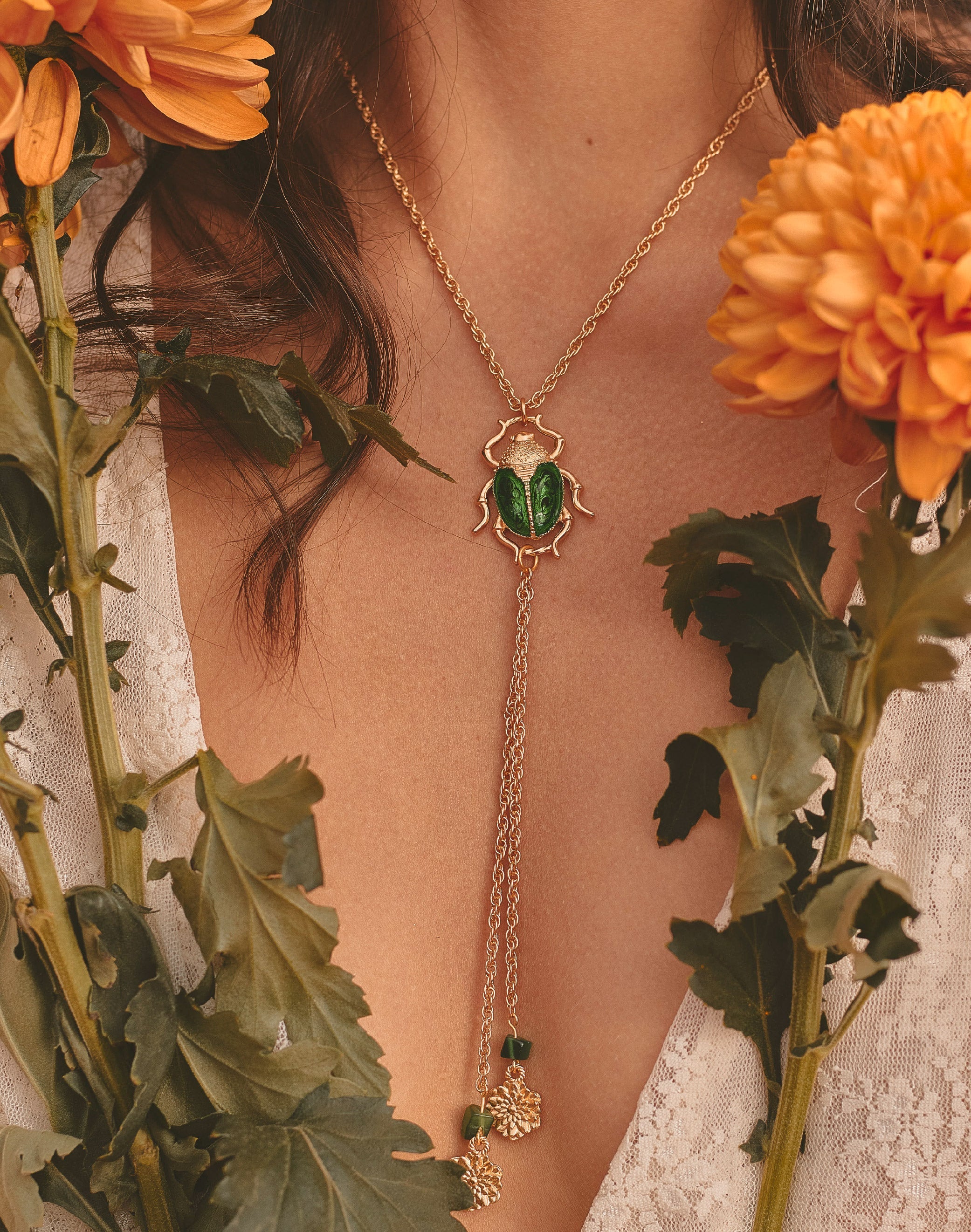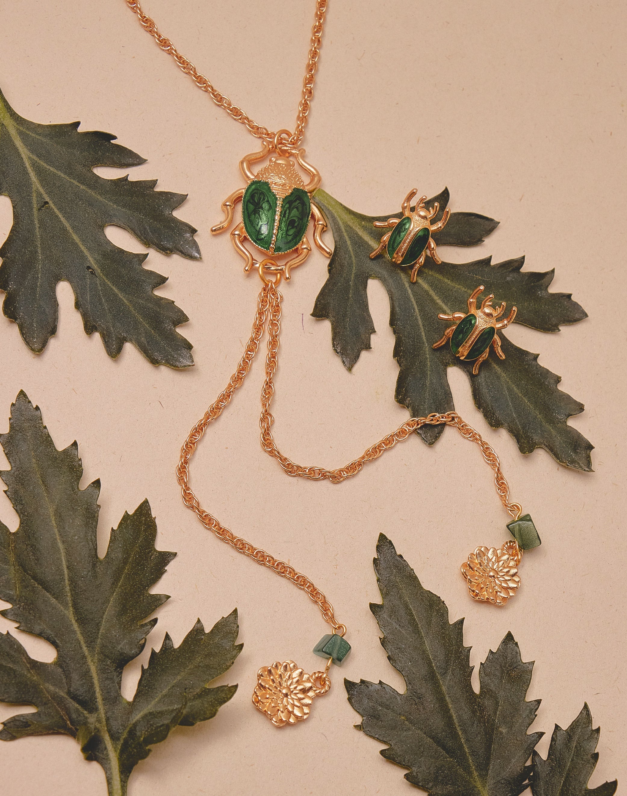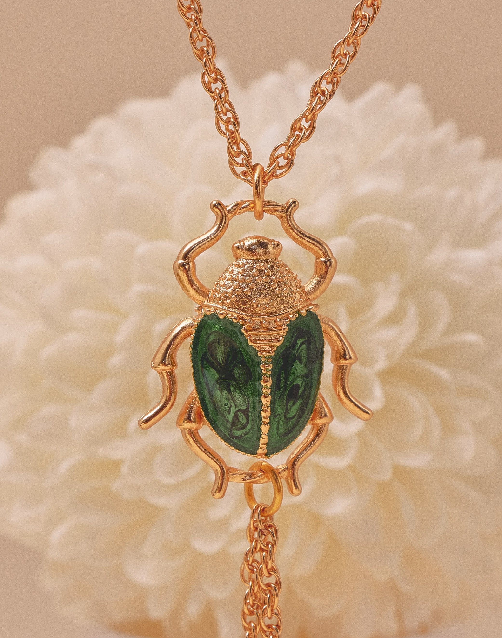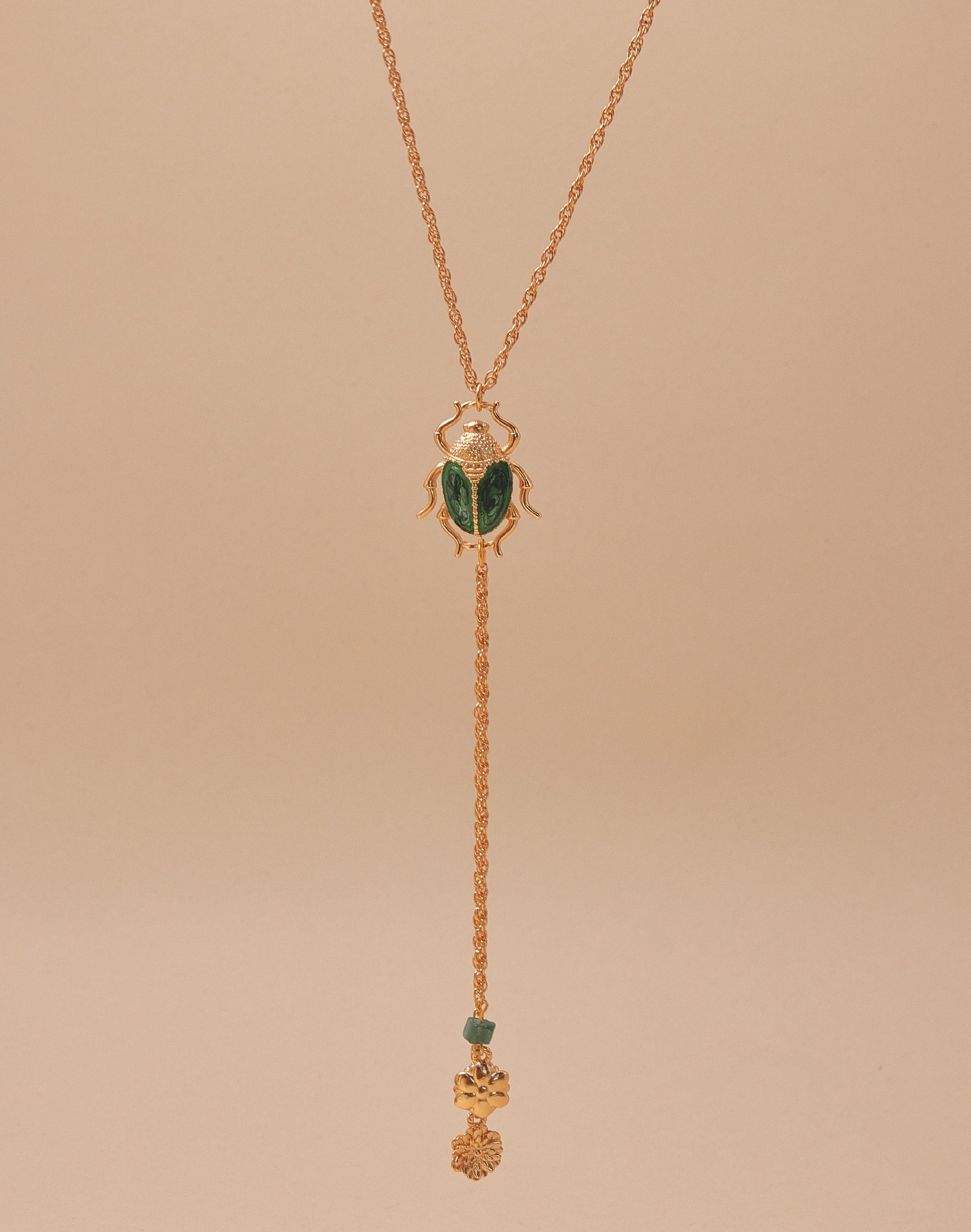 Un collar tipo corbata que une fuerza y delicadeza. El cucarrón en resina verde, pintado a mano, evoca el brillo natural de su caparazón, mientras los crisantemos colgantes simbolizan la...