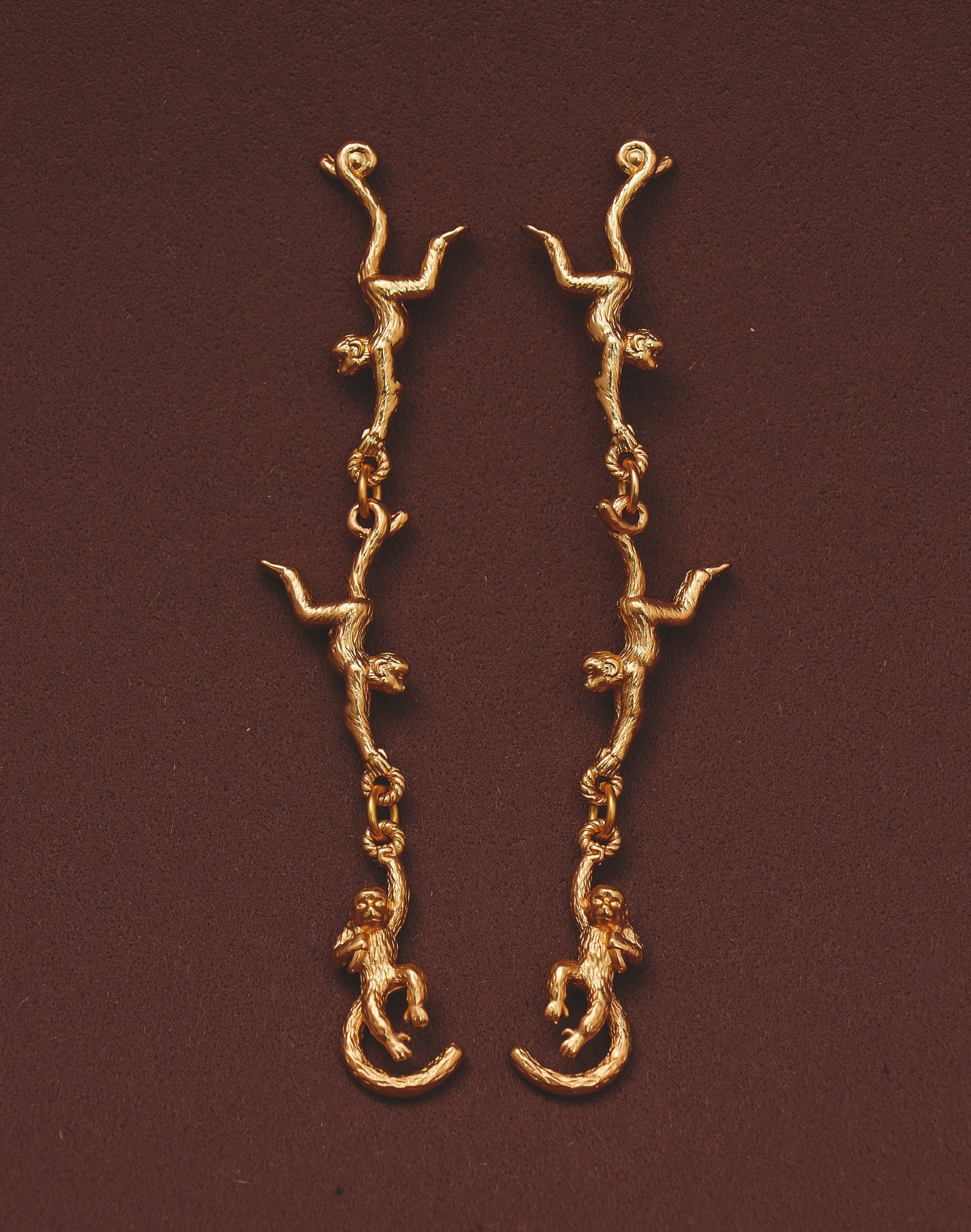 Estos pendientes representan al tití del Pacífico colombiano, una especie que habita los manglares y la selva húmeda de la región. Su diseño de tres monos colgantes crea movimiento y...