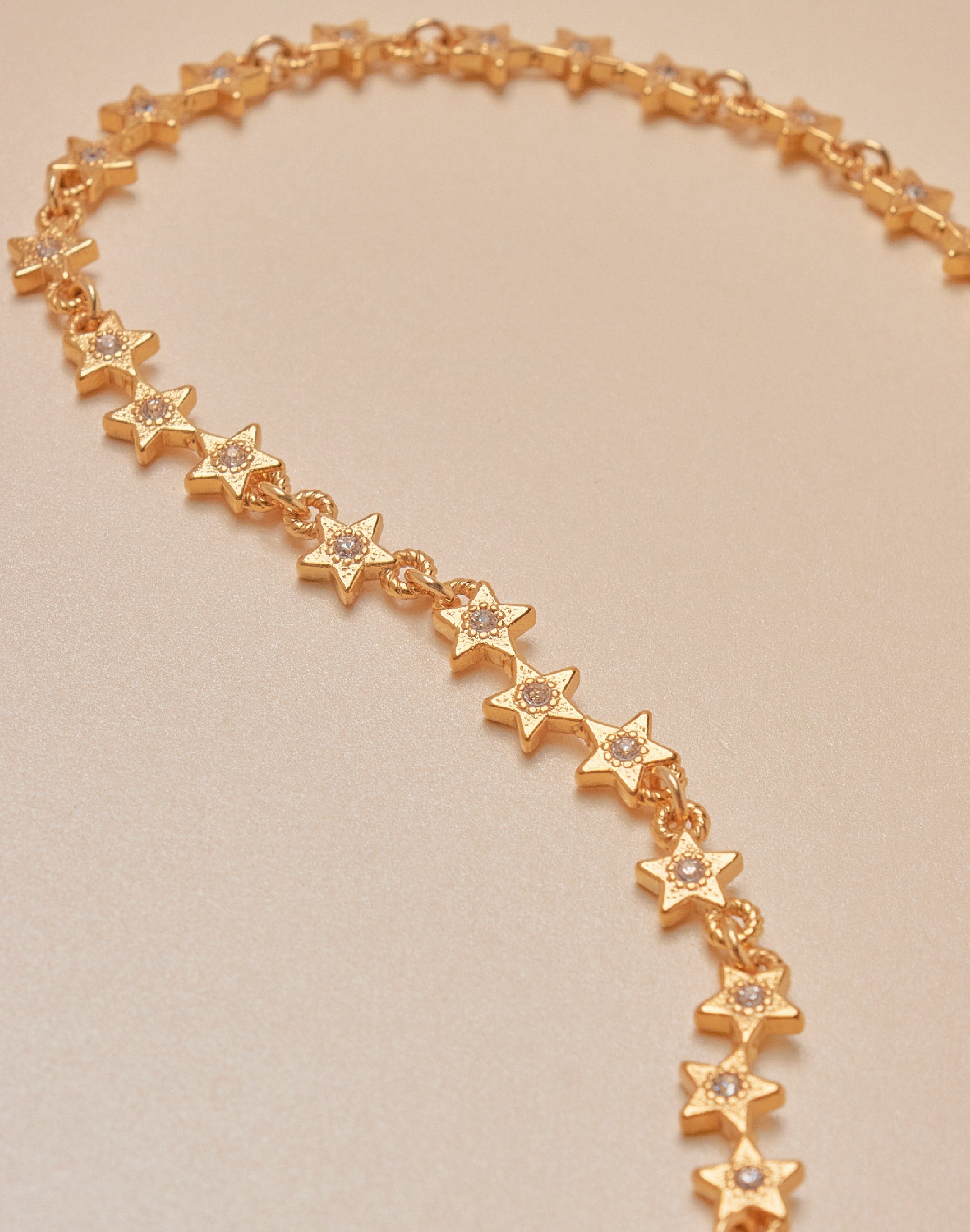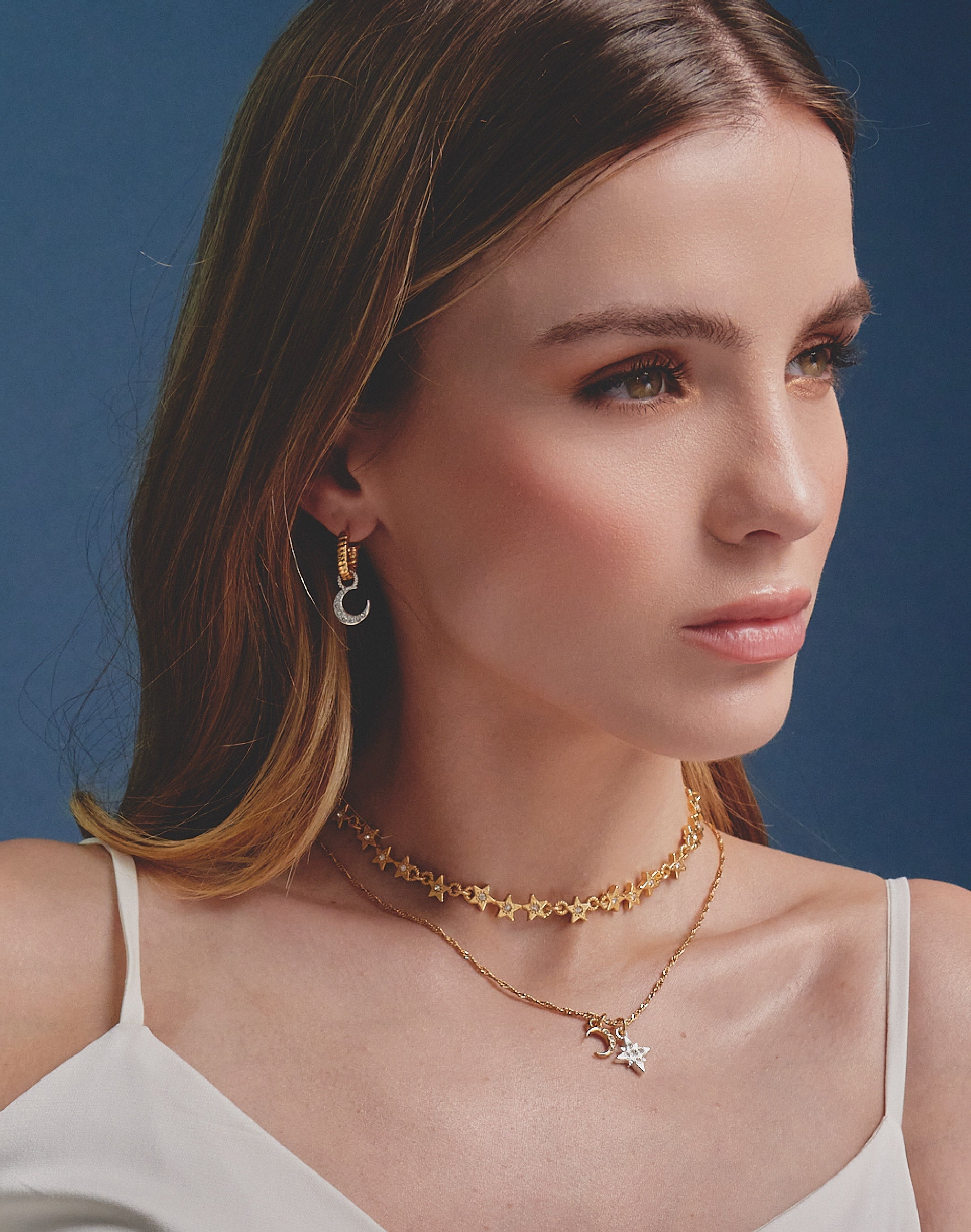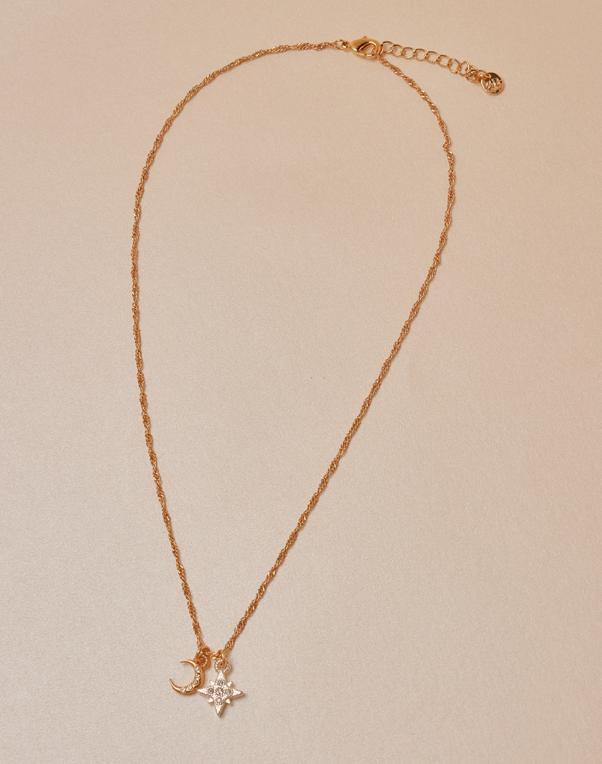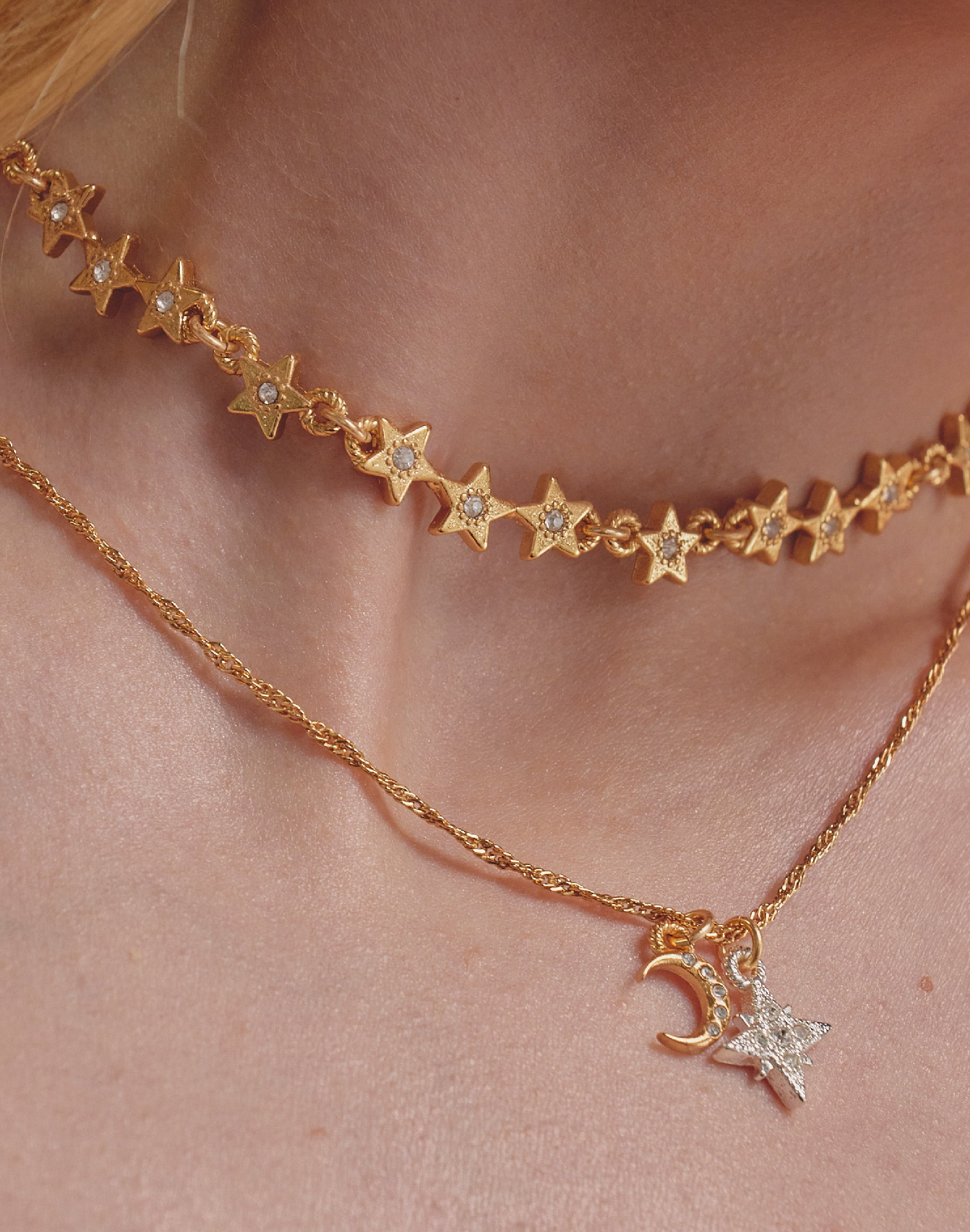Combina un choker de estrellas delicado perfecto para un look minimalista, con una cadena versátil que lleva un dije de estrella y luna. Dos diseños en uno: elige usarlos juntos...