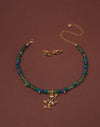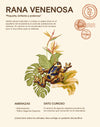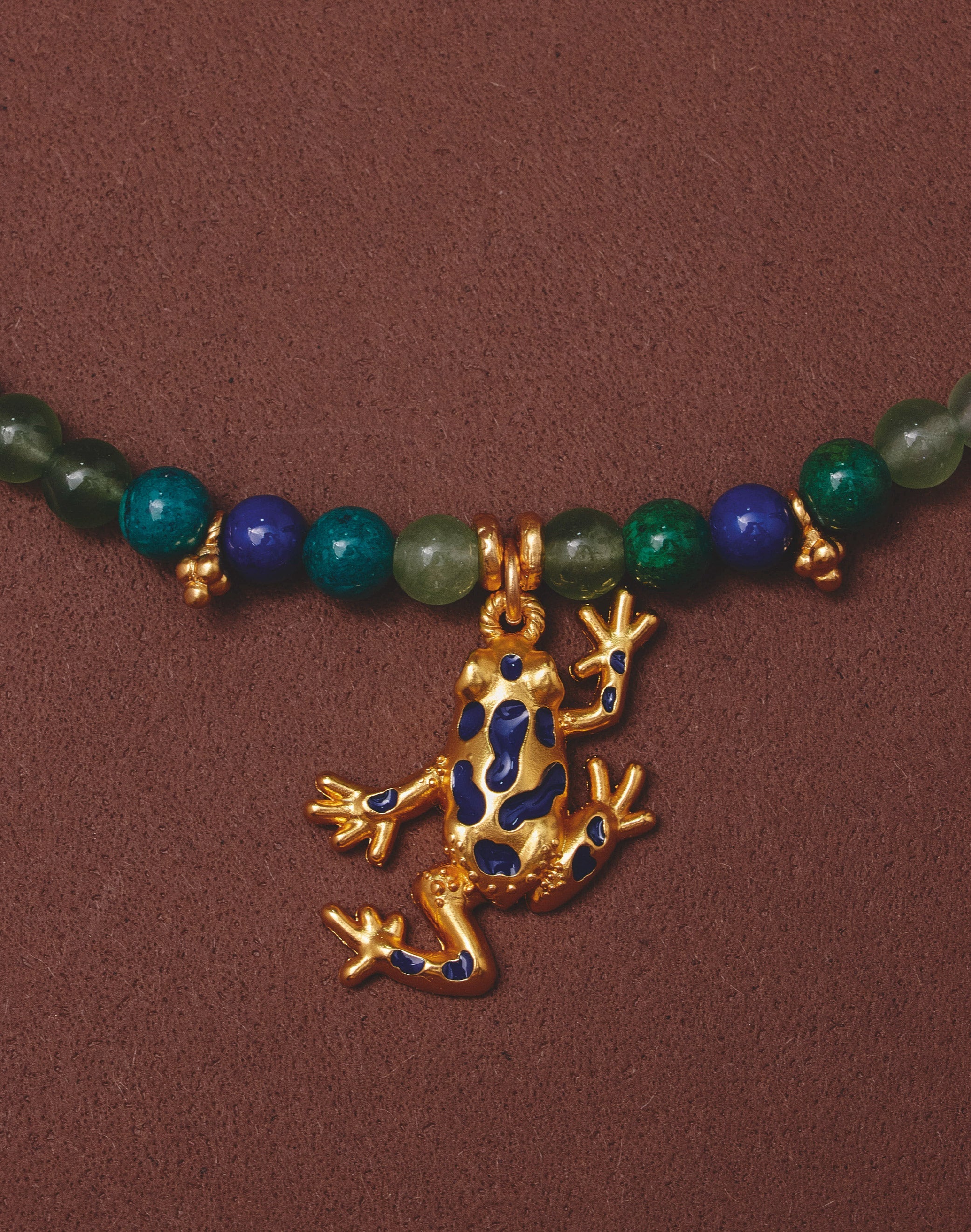 Set compuesto por collar corto y aretes tipo topo, ambos con diseño de rana venenosa. El collar incorpora piedras fósiles en tonos verdes y azules y un dije con decoración en resina azul, logrando un contraste de color sutil y llamativo.